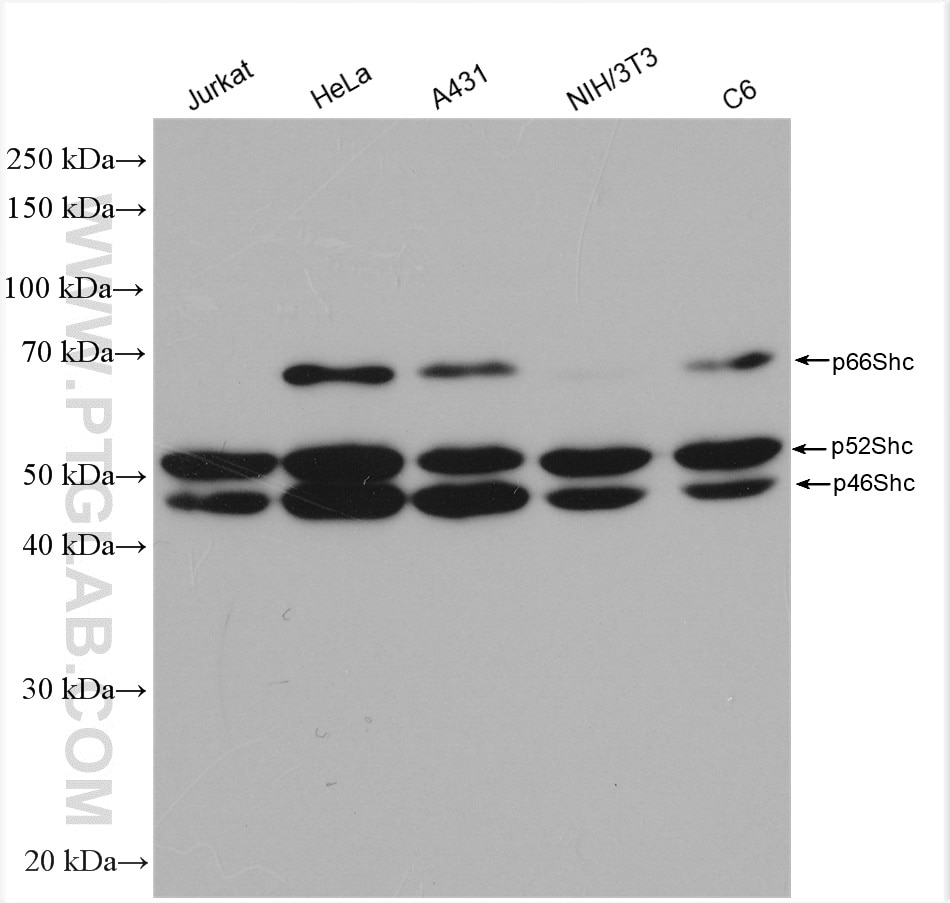 The SHC1 antibody from Proteintech is a rabbit polyclonal antibody to a recombinant protein of human SHC1. This antibody recognizes human, mouse, rat antigen. The SHC1 antibody has been validated for the following applications: WB, IHC, IF/ICC, ELISA analysis.