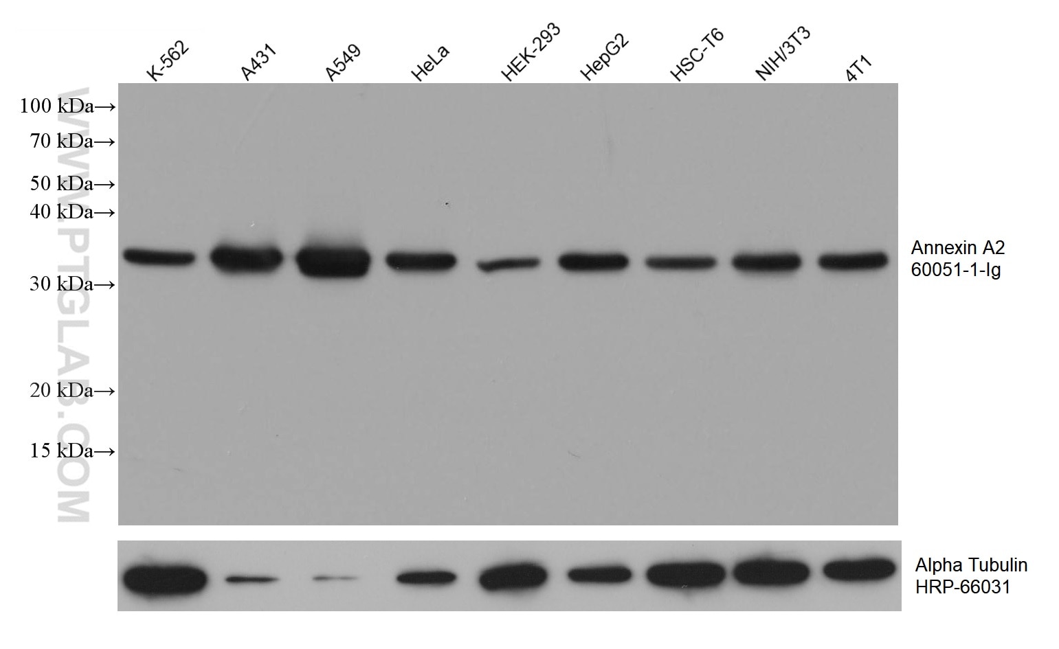 The Annexin A2 antibody from Proteintech is a mouse monoclonal antibody to a recombinant protein of human Annexin A2. This antibody recognizes human, mouse, rat antigen. The Annexin A2 antibody has been validated for the following applications: WB, IHC, IF/ICC, IP, ELISA analysis.