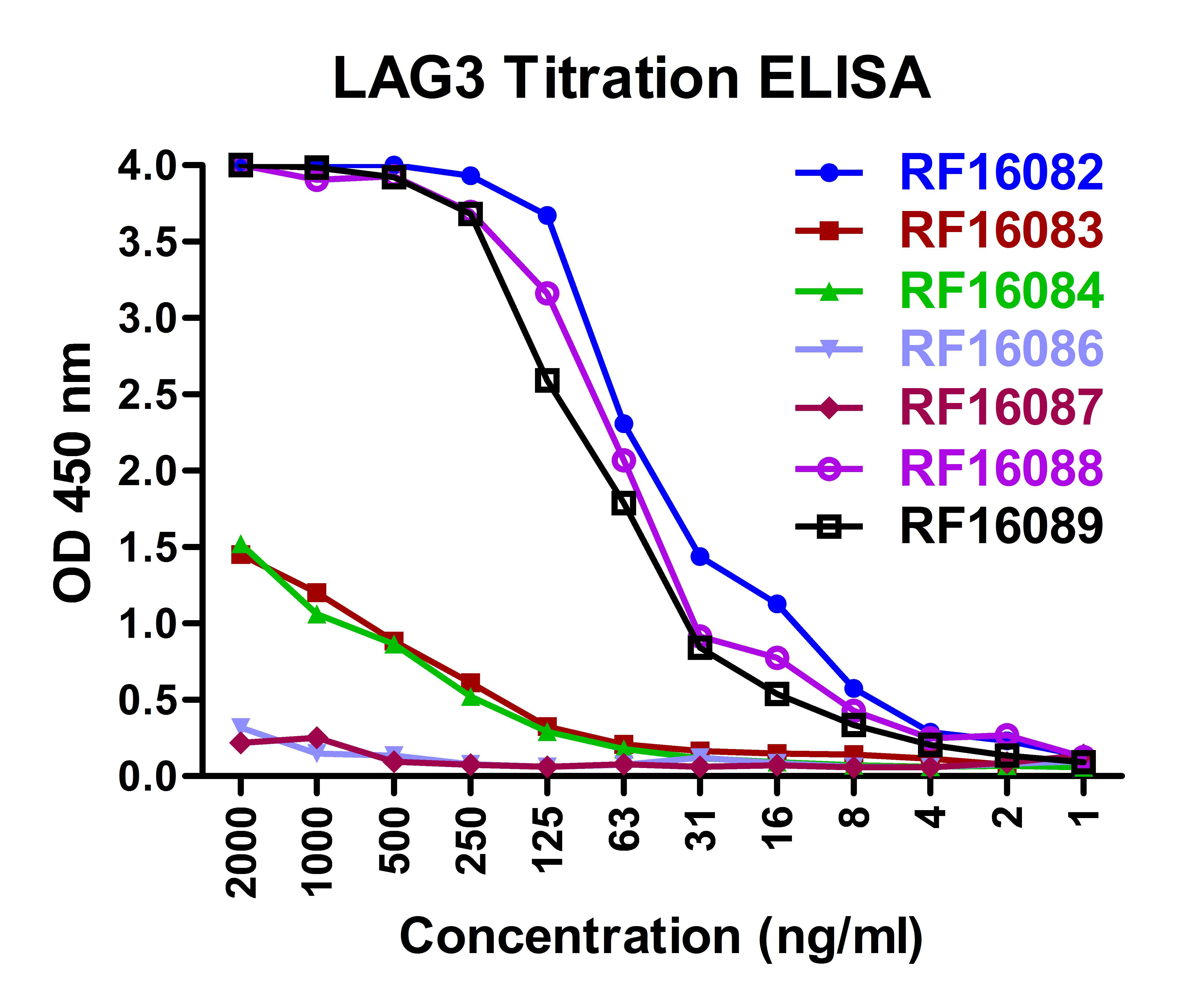 Titration curve analysis of LAG-3 mAbs to detect recombinant LAG-3 in ELISA with RF16082, RF16083, RF16084, RF16086, RF16087, RF16088, and RF16089 antibodies at decreasing concentrations.
