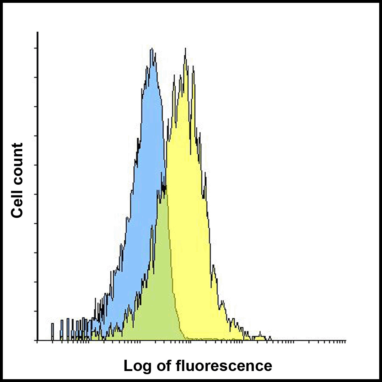 Flow cytometry analysis of TIM-3 overexpressing HEK293 cells using TIM-3 antibody and control mouse IgG antibody at 0.1 μg/ml. Blue: Untransfected HEK293 cells. Yellow: TIM-3 overexpressing HEK293 cells.