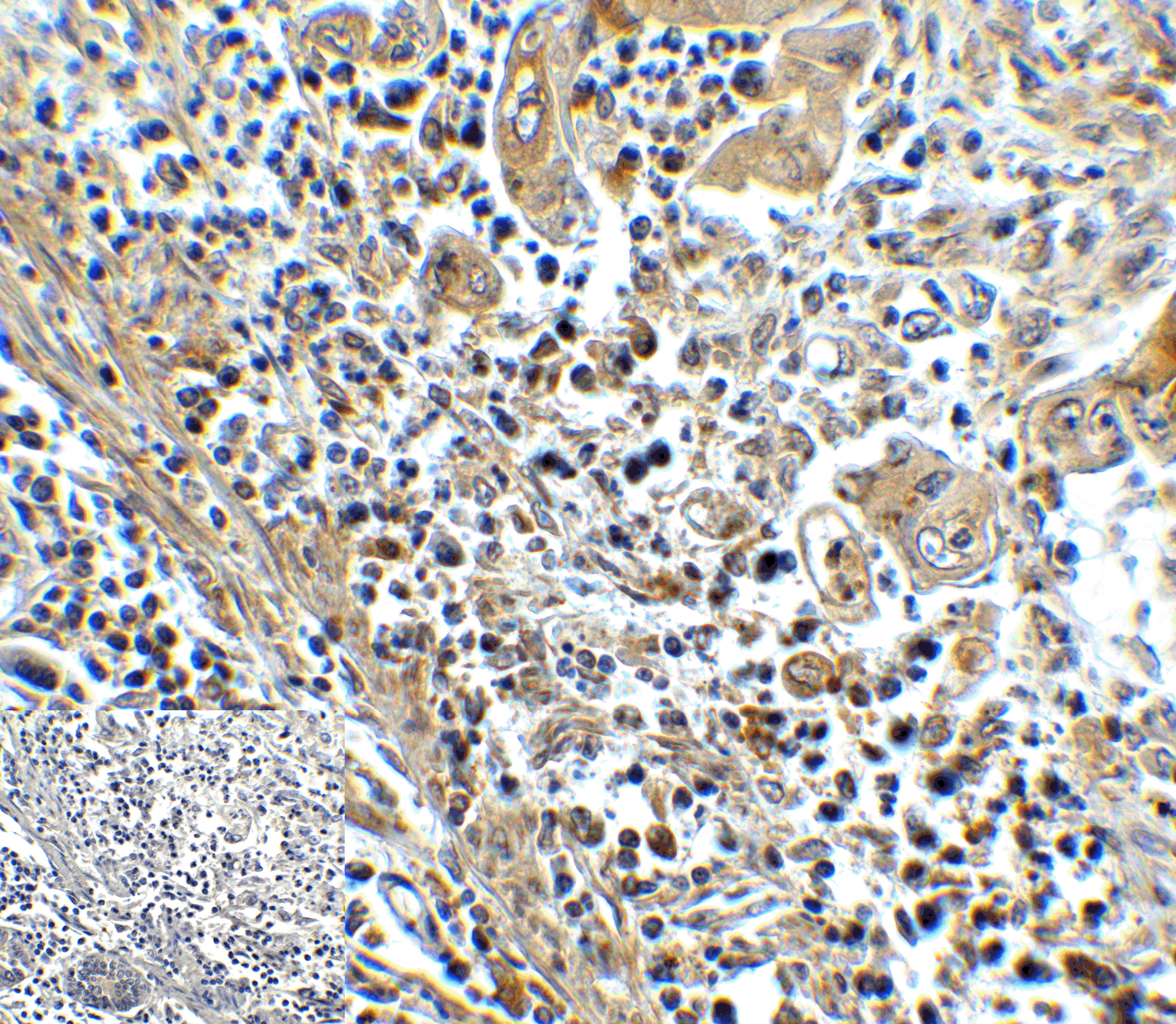 Immunohistochemistry of TIM-3 in human colon carcinoma tissue with TIM-3 antibody at 5 μg/mL.