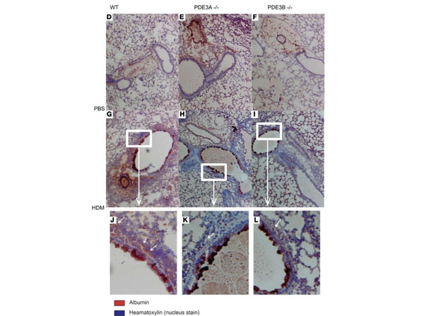 Immunohistochemistry of Anti-Phycoerythrin Antibody Alkaline Phosphatase Conjugated.Less albumin extravasation in HDM-treated?PDE3?/??mice compared with WT mice. (D?I) and ×20 magnification (J?L). Albumin positivity can be seen throughout the entirety of the lung tissue, but is mainly sequestered inside the large blood vessels, perivascular as well as peribronchial. Mucus was also stained for albumin. PBS-treated mice (A?C) were indistinguishable from each other concerning albumin content. WT HDM-treated mice (G?and?J) showed albumin positivity surrounding the bronchioles when compared with?PDE3?/??mice (H,?I,?K, and?L). Original magnification, ×100. Zooming in on (×400) the peribronchial region (highlighted with white rectangle), the smaller vasculature surrounding the bronchiole is albumin-positive in WT mice (J) (highlighted with white arrows) when compared with the?PDE3?/??mice (K?and?L). Kruskal-Wallis test for multiple comparisons was used followed by Mann-Whitney?U?test. Data represent 2 separate experiments (n?= 3 for all PBS groups,?n?= 7 for WT HDM,?n?= 5 for both?PDE3A?/??and?PDE3B?/??HDM groups) and are shown as the mean ± SEM. *P?< 0.05. Figure 3. PMID: 29367458.