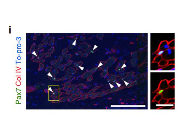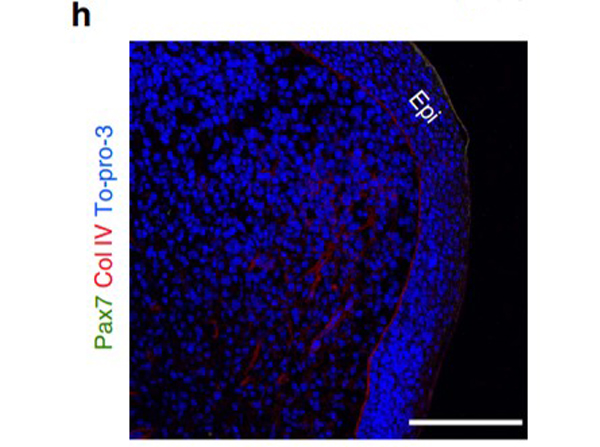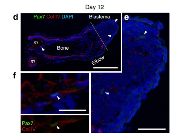 Immunohistochemistry of Anti-Collagen Type IV Antibody Biotin Conjugated. SMFC tracking in larval newt limb regeneration. (g) On day 15 when the regenerating part of the limb grew more distally, the number of Pax7 t nuclei (arrowheads) in the blastema was dramatically increased. Scale bar, 100 mm. Figure 1, PMID: 27026263.