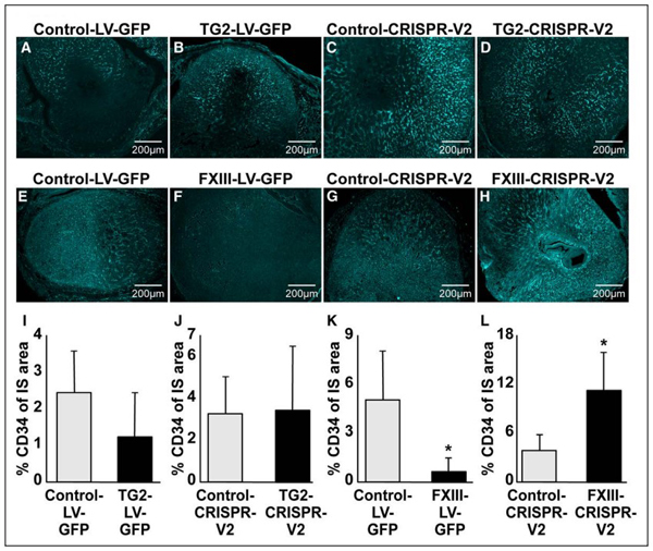 Immunohistochemistry of Anti-Collagen Type IV Antibody Biotin Conjugated. Microvascular evaluation of the implantation site (IS) with transgenic embryos. Immunostaining for CD34 (cluster of differentiation 34) in ISs of genetically modified trophoblast cells (TC) expressing the control vector (LV-GFP [lentivirusgreen fluorescent protein], A and E; CRISPR-V2, C and G, both 4 dams, 10 ISs), overexpressing tissue TG (TG2) (TG2-LV-GFP; B, 4 dams, 12 ISs), depleted from TG2 (tissue TG; D, 3 dams, 10 ISs), overexpressing FXIII (factor XIII; F, 5 dams, 19 ISs) or depleted from FXIII (H, 4 dams, 12 ISs). CD34 was visualized by cyan fluorescence channel after labeled with Cy5-avidin. Similar exposure time was used for each section and its appropriate control. Quantitative analysis of % CD34 staining in relation to IS area of genetically modified TC overexpressing TG2 (I), depleted from TG2 (J), overexpressing FXIII (K) or depleted from FXIII (L). Image scale bars are 200 μm. Fibrinogen was clearly detected in the anti-mesometrial pole and adjacent to control embryonic TC (Figure 5A, upper part). Increased fibrinogen deposition was detected in IS of FXIII-overexpressing TC, particularly in the IS circumference, while fibrinogen was diminished at the embryonic vicinity (Figure 5B, upper part), as compared with control. CIV localization on the control IS (Figure 5A, lower part) was confined to the anti-mesometrial pole and around the primary decidual zone, while a substantial wider partition was displayed on the FXIII overexpressed TC (Figure 5B, lower part). Inversely to the IS with FXIII overexpressed TC, fibrinogen and Collagen Type IV were hardly detected in IS with FXIII-depleted TC (Figure 5D) relative to control (Figure 5C). Figure 5, PMID: 31189431.