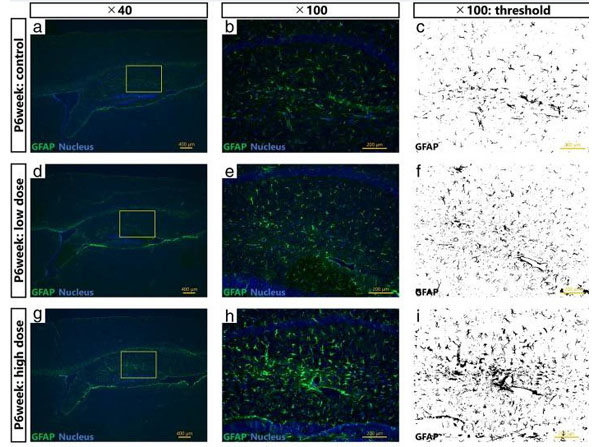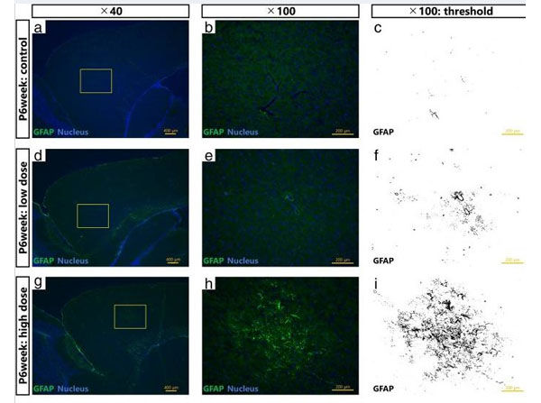 Maternal exposure to Printex 90 carbon nanoparticles dose-dependently increases expression levels of glial fibrillary acidic protein (GFAP) in astrocytes in the offspring hippocampus.?a,?b,?d,?e,?g?and?h?show representative fluorescent micrographs of GFAP-positive astrocytes in the hippocampi of 6?week old male offspring in the control (a,?b), low exposure (d,?e), and high exposure group (g,?h).?a,?d?and?g?gives an overview of the hippocampus, with?b,?e, and?h?providing enlarged views of panels?a,?d, and?g, respectively.?c,?f, and?i?are grayscale views of?b,?e, and?h, respectively, for quantification of GFAP expression. Fig. 5. PMID: 30201004.