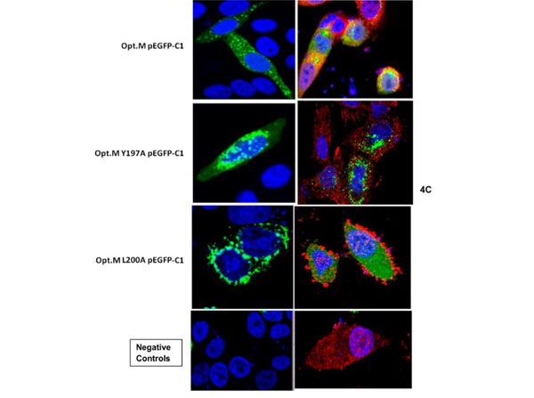 Immunofluorescence results using Donkey Anti-Goat IgG DyLight 800.Effect of mutation in YXXL domain of HRSV M protein.C) The mutation of the tyrosine at amino acid residue 197 to alanine and leucine at amino acid residue 200 to alanine causes a distinct phenotypic change in the localization of the HRSV Matrix protein. HEp2 cells were transfected with indicated pEGFP-C1 Opt. M constructs and were fixed with paraformaldehyde at 24 hours post transfection as described previously. Cells were imaged for Opt.M, adaptor protein and DAPI using CLSM protocols described previously. Negative controls include transfection of cells with empty plasmid vector (pEGFP-C1) without M insert (left side panel) and mock transfected cells with staining for adaptor protein only with goat anti Ap3u3A followed by rabbit anti goat Alexa Fluor 546 antibody (right side panel). The first 3 images on the left side panel shows staining for Opt.M and DAPI. The first 3 images on the right side panel shows merged image with staining for Opt.M, adaptor protein and DAPI. The results were reproducible in at least two independent assays.?Fig 4. PMID: 29028839.