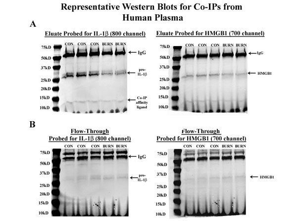 Entire western blots for co-immunoprecipitation of HMGB1 and IL-1β in human plasma.Co-immunoprecipitation was performed for HMGB1 and IL-1β in human control and burn plasma. Entire eluate and flow through for these samples are presented. (A) Entire blots of eluates probed for IL-1β and for HMGB1. Bands positive for IgG and pro-IL-1β as well as the Catch and ReleaseR affinity ligand were observed. The blot probed for HMGB1 showed a broad band consistent with free HMGB1 near 29kD. (B) Entire western blots of flow through. Minimal pro-IL-1β and HMGB1 were found in the flow through. Fig S4. PMID:29601597.