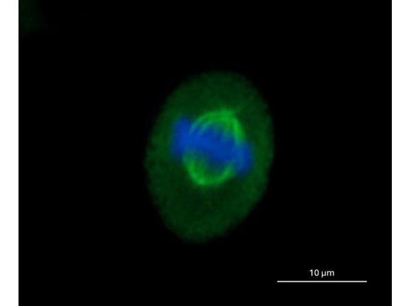 Immunofluorescence of Goat Anti-Mouse IgG (H&L) Antibody DyLight? 488 Conjugated (Min X Bv Ch Gt GP Ham Hs Hu Rb Rt & Sh Serum Proteins). Cell line:? HeLa?. Primary Antibody: Alpha Tubulin? (p/n 200-301-880?) at 4 μg/mL (1:250) for 1hr at RT?. Secondary Antibody: Goat Anti-Mouse? DyLight? 488? (p/n 610-141-121?) at 0.1 μg/mL (1:10000) overnight at 4 °C?. Fixative:? Ice Cold Methanol?. Permeabilization: Ice Cold Methanol?. Nuclear stain:? Hoechst 33342?. Magnification: 40X. Expected Localization:? Cytoplasmic?. Image: HeLa cell nucleus in the metaphase stage of mitosis. Microtubule-based mitotic spindles are clearly visible.