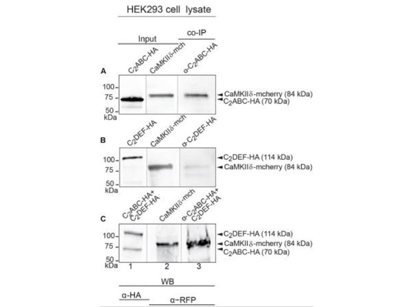 Immunoprecipitation and western blot show interaction of otoferlin with CaMKIIδ. (A?C) Two HA-tagged mouse otoferlin fragments, C2ABC (aa 1?632 in NP_001093865; 70 kDa) and C2DEF (aa 933?1920; 114 kDa) were co-transfected with mcherry-tagged mouse CaMKIIδ into HEK293 cells. Transfections were performed either with otoferlin C2ABC and CaMKIIδ (A, Input Lane 1 and 2), otoferlin C2DEF and CaMKIIδ (B, Input Lane 1 and 2) or in the presence of both C2ABC and C2DEF fragments and CaMKIIδ (C, Input Lane 1 and 2). Co-immunoprecipitations of C2ABC-HA and C2DEF-HA were conducted from HEK293 cell lysates using anti-HA antibodies (p/n 600-401-384). CaMKIIδ-mcherry was detected in the eluate using an anti-RFP (red fluorescent protein) antibody (p/n 200-301-379) (A?C, Lane 3), indicating that CaMKIIδ co-precipitated with recombinant otoferlin fragments. Secondary anti-rabbit Dylight680 (p/n 611-144-003) and anti-mouse Dylight800 antibodies (p/n 610-145-003) (1:10,000). FIGURE 5. PMID: 29046633.