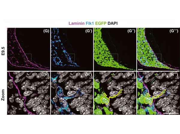 Penetration and distribution of neural crest-derived cells (NCDCs) in the?P0-Cre/EGFP?mouse telencephalon. (G?H′′′) A coronal section at the telencephalic level of the E9.5 embryo is stained with anti-laminin, Flk1, GFP antibodies and counter-stained 4′, 6-diamidino-2-phenylindole (DAPI). High-magnification images within the squares in G?G′′′ are shown in H?H′′′. Through the laminin+?basement membrane (H), an endothelial cell (white dashed line in H′) invades the telencephalon together with an EGFP+?cell (yellow line in H′′). Scale bars: (for G?G′′′), 50?μm; H′′′ (for H?H′′′), 25?μm. Figure 2. PMID: 23157329.