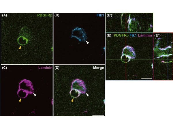 The usability of PDGFRβ and NG2 as pericyte markers in the telencephalon. (A?E′′) Immunostaining with anti-PDGFRβ, Flk1, and laminin antibodies on coronal section at the telencephalic level of E11.5?P0-Cre?mouse embryo. (A?D) A PDGFRβ+?pericyte (yellow arrowheads) wraps around Flk1+?endothelial tube (white arrowheads), and these cell types are surrounded by laminin+?basement membrane. This pattern is also clearly observed in orthogonal view of the image shown in D (E?E′′). Fig 3. PMID: 23157329.