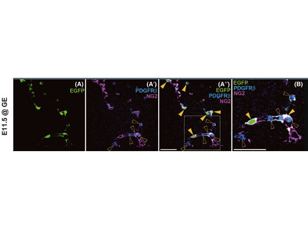 Existence of non-pericyte enhanced green fluorescent protein (EGFP+) cells in the telencephalon of E11.5?P0-Cre/EGFP?mice. (A-B) A coronal section at the telencephalic level is stained with anti-GFP, PDGFRβ, and NG2 antibodies. Most of EGFP+?cells express both PDGFRβ and NG2 (yellow arrowheads). (B) High-magnification of the dashed square in A′′. PDGFRβ is also expressed in hematopoietic cells (open arrowheads in A′?B). Fig 5. PMID: 23157329.