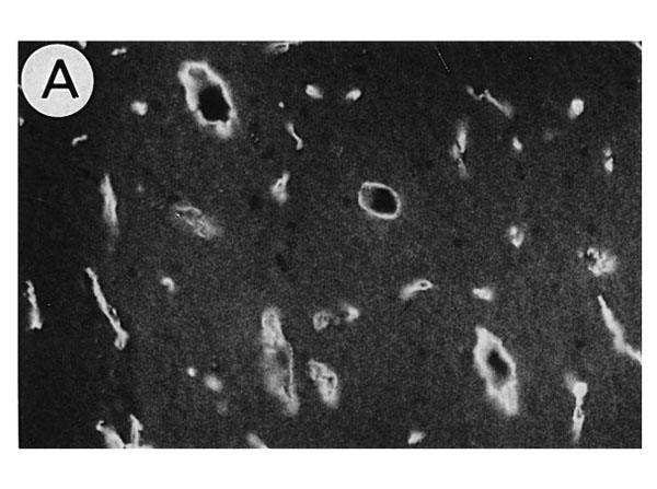 Expression of APN in brain parenchyma vessels. Adult mice were perfused with 4% paraformaldehyde and brain sections incubated with the antibody ER-BMDM1 or a mixture of ER-BMDM1 and antiserum to the VW factor as indicated in Section 2. (A) Single labelling with ER- ? . BMDM1. Fig 1. PMID: 10350564.