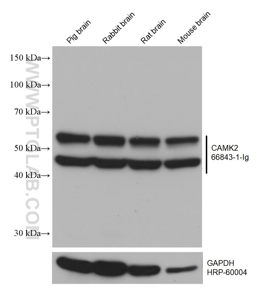 The CaMKII alpha antibody from Proteintech is a mouse monoclonal antibody to a recombinant protein of human CaMKII alpha. This antibody recognizes human, mouse, rat, pig antigen. The CaMKII alpha antibody has been validated for the following applications: WB, IHC, IF/ICC, ELISA analysis.