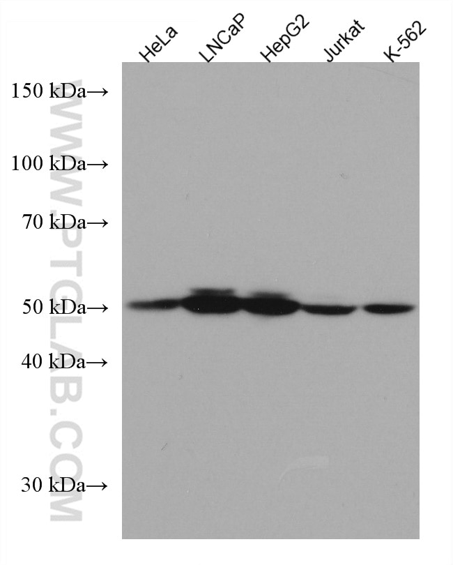The RCC1 antibody from Proteintech is a mouse monoclonal antibody to a recombinant protein of human RCC1. This antibody recognizes human, mouse antigen. The RCC1 antibody has been validated for the following applications: WB, IHC, ELISA analysis.