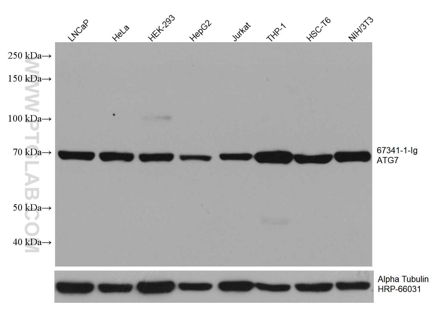 The ATG7 antibody from Proteintech is a mouse monoclonal antibody to a recombinant protein of human ATG7. This antibody recognizes human, mouse, rat, pig antigen. The ATG7 antibody has been validated for the following applications: WB, IHC, IF/ICC, FC (Intra), ELISA analysis.