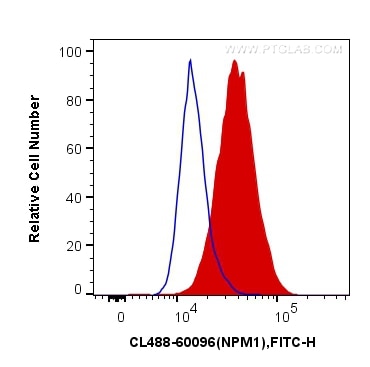 The B23/NPM1 antibody from Proteintech is a mouse monoclonal antibody to a recombinant protein of human B23/NPM1. This antibody recognizes human, mouse, rat antigen. The B23/NPM1 antibody has been validated for the following applications: IF/ICC, FC (Intra) analysis. This antibody is coraliteR plus 488.