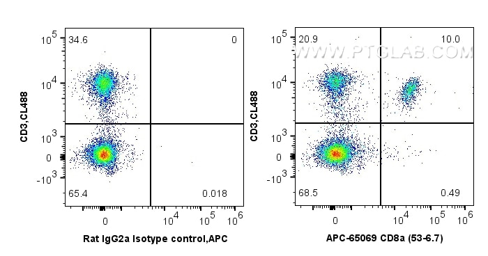The CD8a antibody from Proteintech is a rat monoclonal antibody to a spleen cells or thymocyte membranes of mouse CD8a. This antibody recognizes mouse antigen. The CD8a antibody has been validated for the following applications: FC analysis. This antibody is apc.