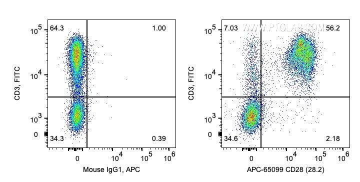 The CD28 antibody from Proteintech is a mouse monoclonal antibody to a n/a of human CD28. This antibody recognizes human antigen. The CD28 antibody has been validated for the following applications: FC analysis. This antibody is apc.