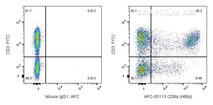The CD8a antibody from Proteintech is a mouse monoclonal antibody to a n/a of human CD8a. This antibody recognizes human antigen. The CD8a antibody has been validated for the following applications: FC analysis. This antibody is apc.