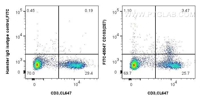 The CD103 antibody from Proteintech is a hamster monoclonal antibody to a c57bl/6j mouse intestinal intraepithelial lymphocytes (iel) of mouse CD103. This antibody recognizes mouse antigen. The CD103 antibody has been validated for the following applications: FC analysis. This antibody is fitc plus.