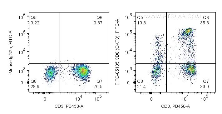 The CD8a antibody from Proteintech is a mouse monoclonal antibody to a human thymocytes of human CD8a. This antibody recognizes human antigen. The CD8a antibody has been validated for the following applications: FC analysis. This antibody is fitc plus.