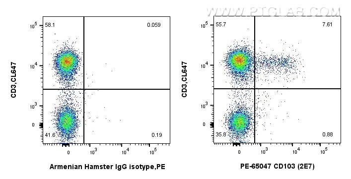 The CD103 antibody from Proteintech is a hamster monoclonal antibody to a c57bl/6j mouse intestinal intraepithelial lymphocytes (iel) of mouse CD103. This antibody recognizes mouse antigen. The CD103 antibody has been validated for the following applications: FC analysis. This antibody is pe.