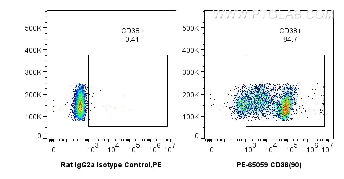 The CD38 antibody from Proteintech is a rat monoclonal antibody to a mouse bone marrow pre-b cells of mouse CD38. This antibody recognizes mouse antigen. The CD38 antibody has been validated for the following applications: FC analysis. This antibody is pe.