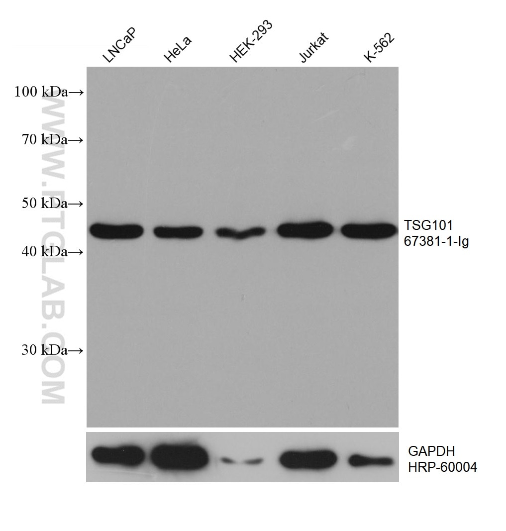 The TSG101 antibody from Proteintech is a mouse monoclonal antibody to a recombinant protein of human TSG101. This antibody recognizes human, mouse, rat antigen. The TSG101 antibody has been validated for the following applications: WB, IHC, IF/ICC, IF-P, ELISA analysis.