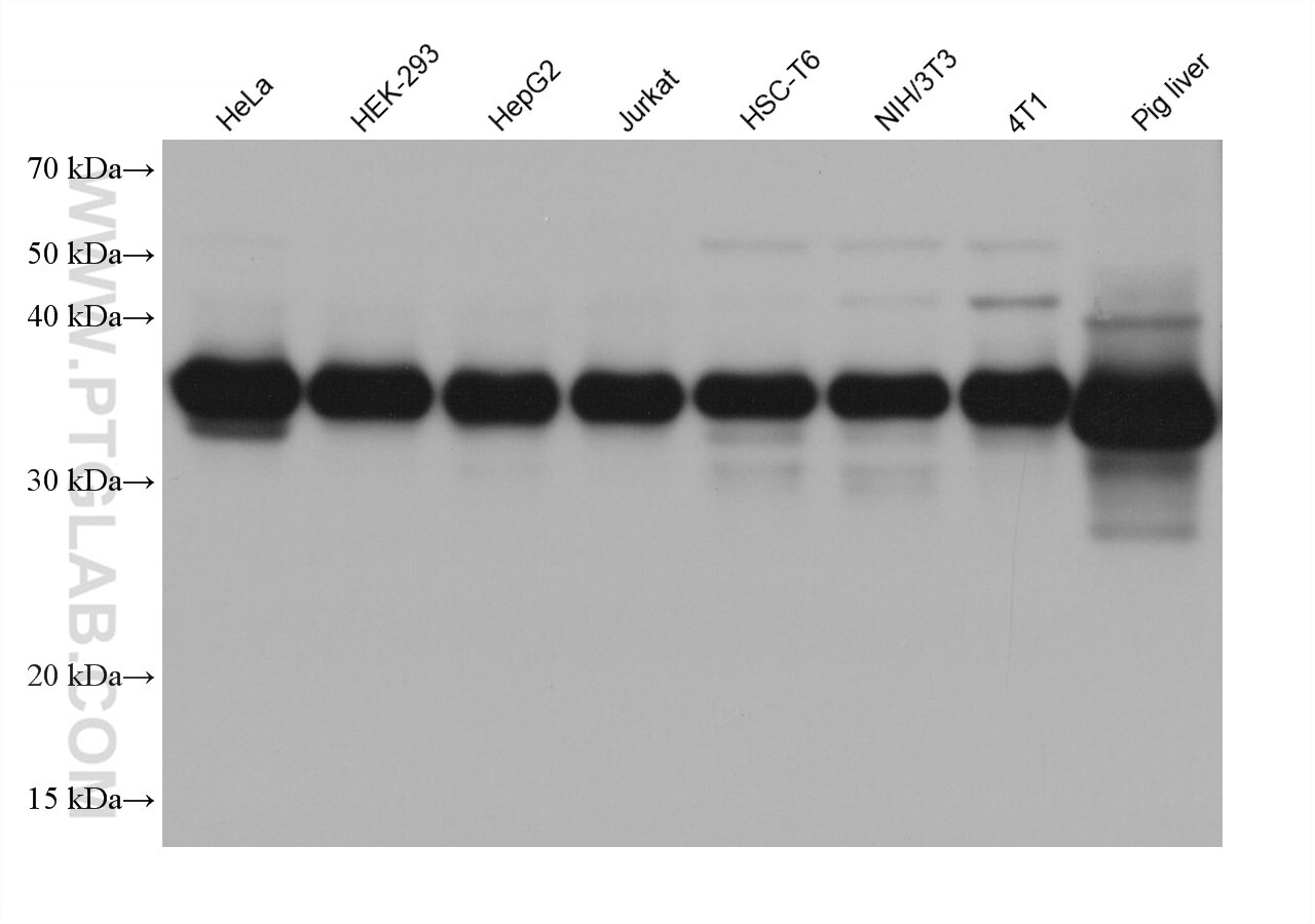 The ALDOA antibody from Proteintech is a mouse monoclonal antibody to a recombinant protein of human ALDOA. This antibody recognizes human, mouse, rat, pig antigen. The ALDOA antibody has been validated for the following applications: WB, IHC, IF/ICC, ELISA analysis.
