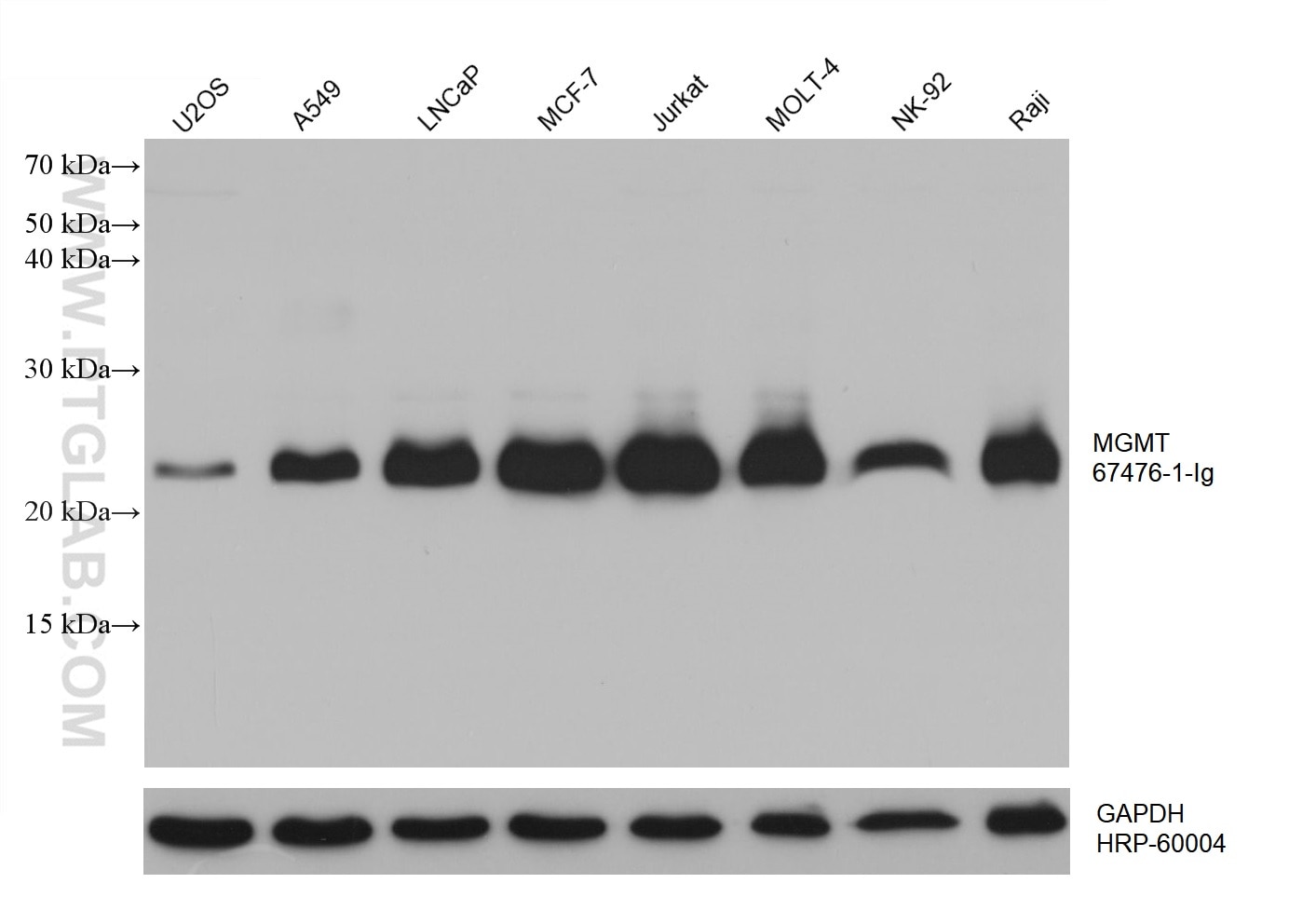 The MGMT antibody from Proteintech is a mouse monoclonal antibody to a recombinant protein of human MGMT. This antibody recognizes human antigen. The MGMT antibody has been validated for the following applications: WB, IF/ICC, FC (Intra), ELISA analysis.