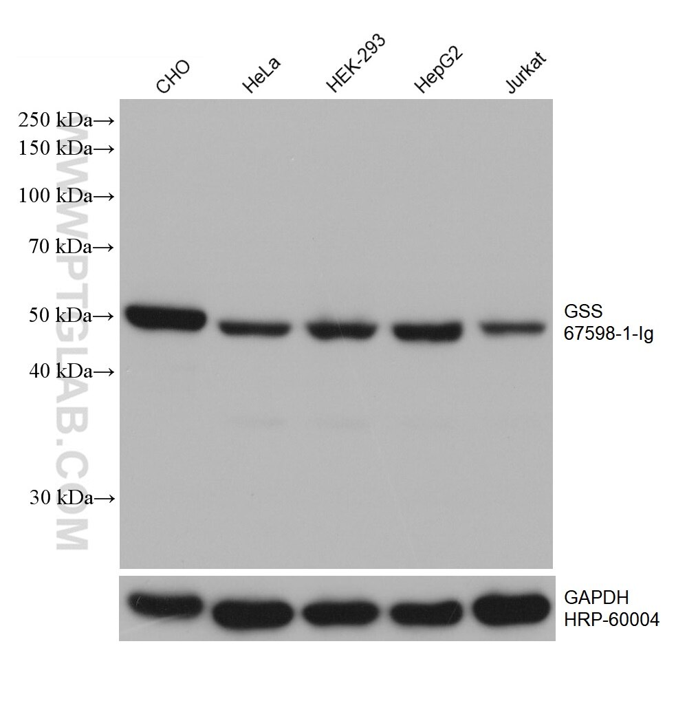 The GSS antibody from Proteintech is a mouse monoclonal antibody to a recombinant protein of human GSS. This antibody recognizes human, mouse, rat, pig, hamster antigen. The GSS antibody has been validated for the following applications: WB, IHC, IF/ICC, ELISA analysis.