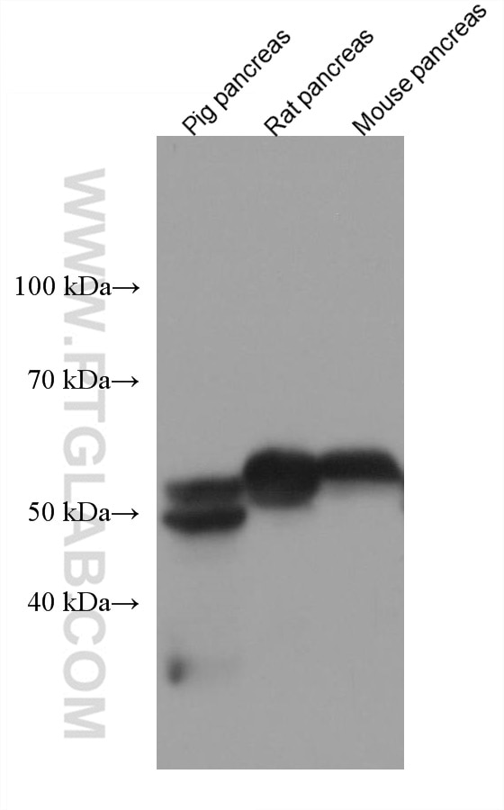 The PNLIPRP1 antibody from Proteintech is a mouse monoclonal antibody to a recombinant protein of human PNLIPRP1. This antibody recognizes human, mouse, rat, pig antigen. The PNLIPRP1 antibody has been validated for the following applications: WB, IHC, ELISA analysis.