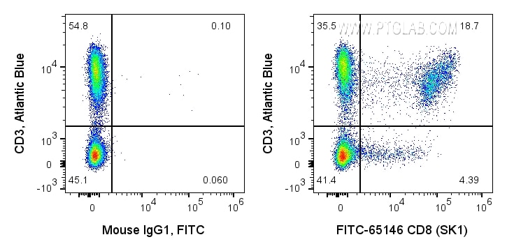 The CD8 antibody from Proteintech is a mouse monoclonal antibody to a n/a of human CD8. This antibody recognizes human antigen. The CD8 antibody has been validated for the following applications: FC analysis. This antibody is fitc plus.