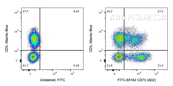 The CD73 antibody from Proteintech is a mouse monoclonal antibody to a pre-b leukemia cell line of human CD73. This antibody recognizes human antigen. The CD73 antibody has been validated for the following applications: FC analysis. This antibody is fitc plus.