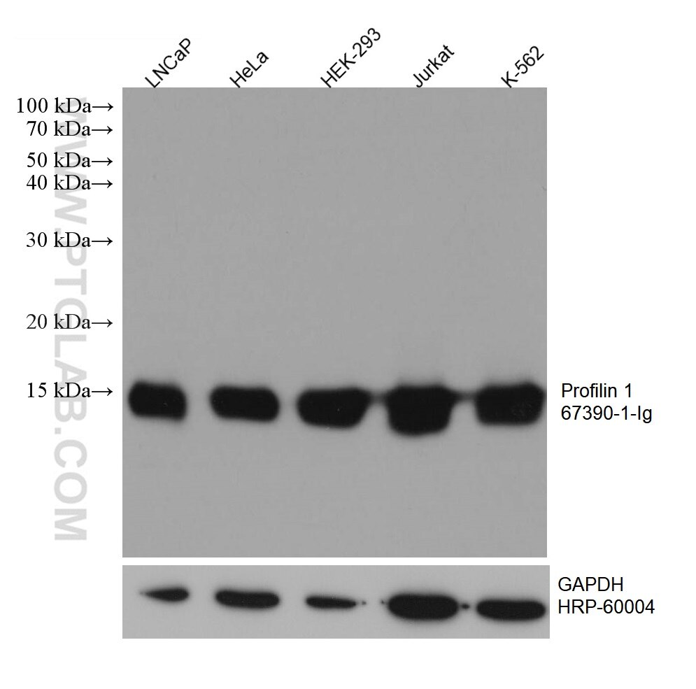 The Profilin 1 antibody from Proteintech is a mouse monoclonal antibody to a recombinant protein of human Profilin 1. This antibody recognizes human, mouse, rat antigen. The Profilin 1 antibody has been validated for the following applications: WB, IHC, IF/ICC, ELISA analysis.