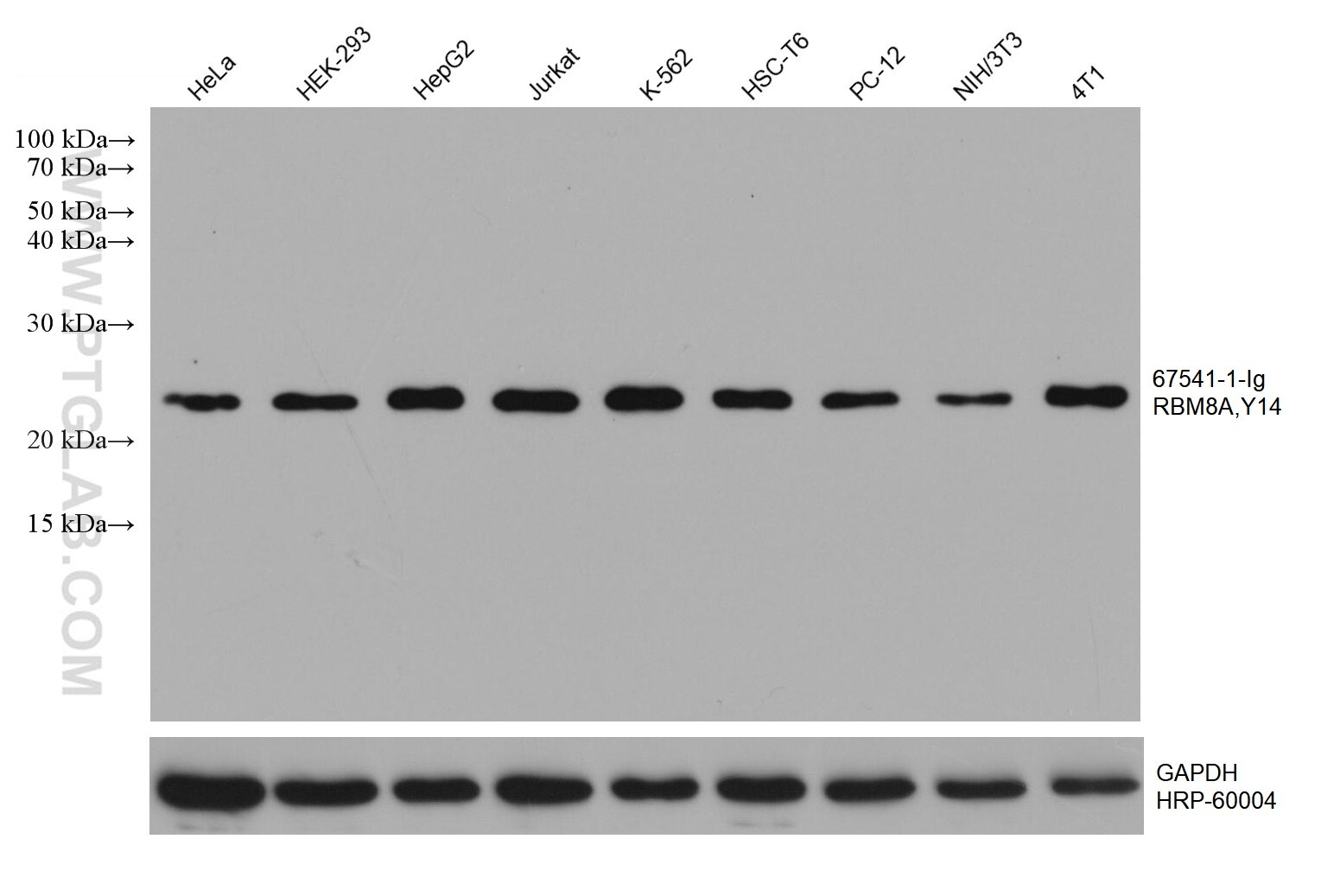 The RBM8A,Y14 antibody from Proteintech is a mouse monoclonal antibody to a recombinant protein of human RBM8A,Y14. This antibody recognizes human, mouse, rat antigen. The RBM8A,Y14 antibody has been validated for the following applications: WB, IHC, IF/ICC, ELISA analysis.