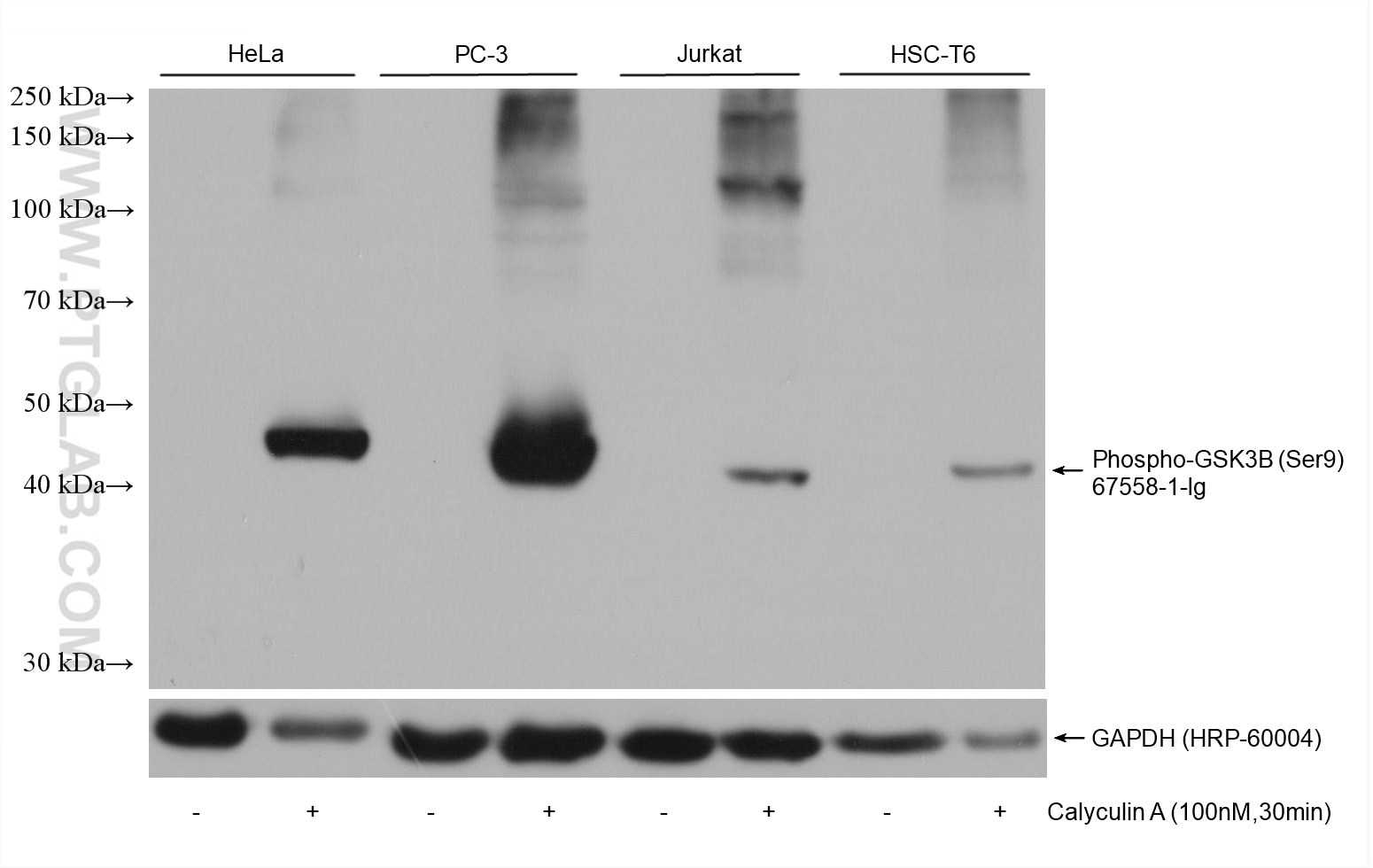 The Phospho-GSK3B (Ser9) antibody from Proteintech is a mouse monoclonal antibody to a peptide of human Phospho-GSK3B (Ser9). This antibody recognizes human antigen. The Phospho-GSK3B (Ser9) antibody has been validated for the following applications: WB, IHC, IF/ICC, ELISA analysis.