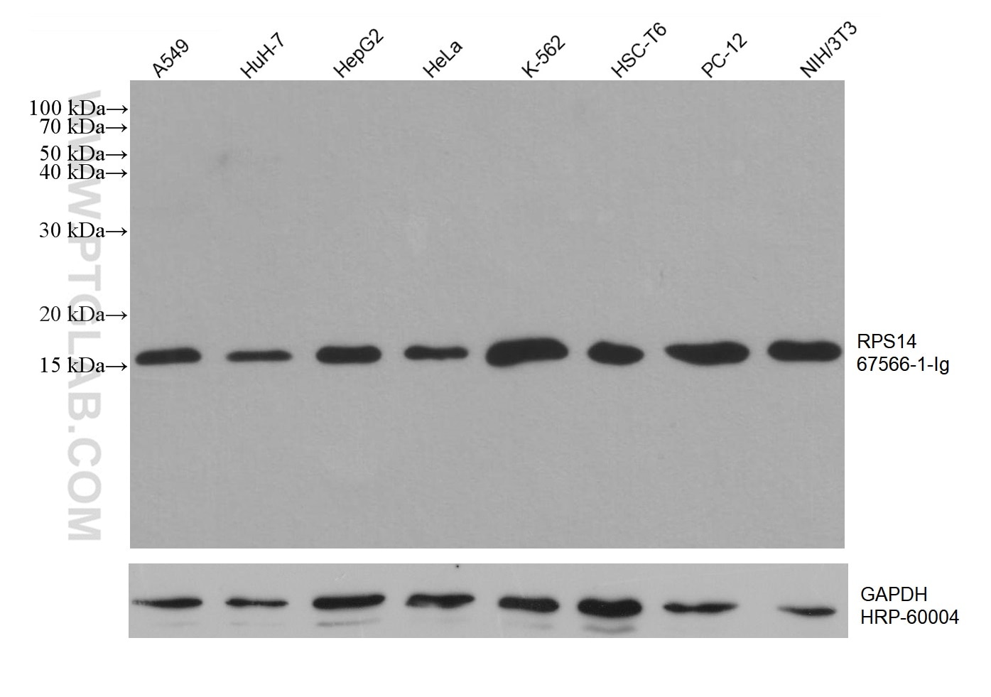 The RPS14 antibody from Proteintech is a mouse monoclonal antibody to a recombinant protein of human RPS14. This antibody recognizes human, mouse, rat antigen. The RPS14 antibody has been validated for the following applications: WB, IHC, IF/ICC, ELISA analysis.