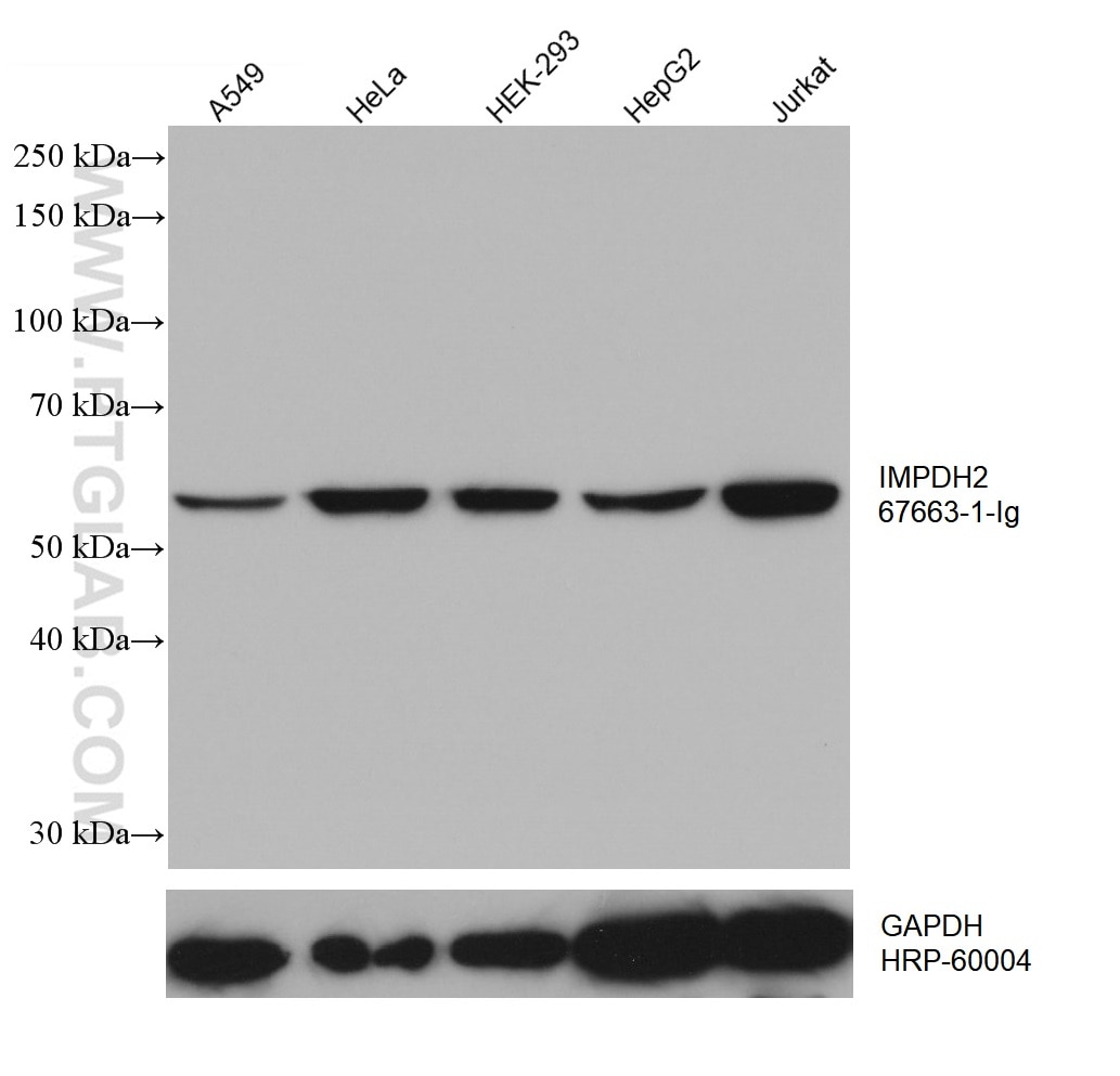 The IMPDH2 antibody from Proteintech is a mouse monoclonal antibody to a recombinant protein of human IMPDH2. This antibody recognizes human, mouse, rat antigen. The IMPDH2 antibody has been validated for the following applications: WB, IHC, IF/ICC, ELISA analysis.