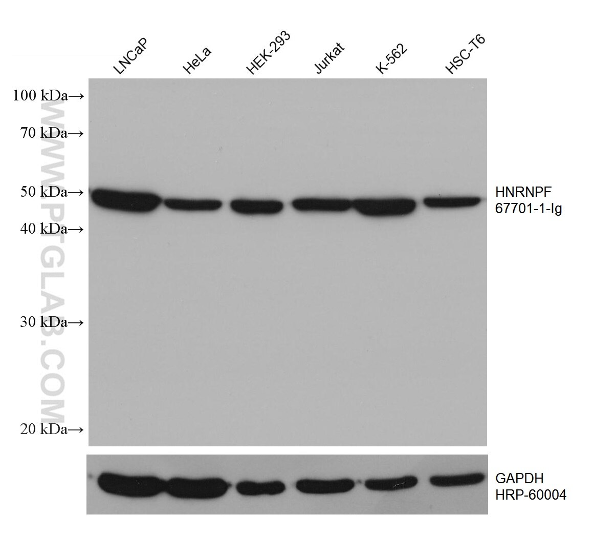 The HNRNPF antibody from Proteintech is a mouse monoclonal antibody to a recombinant protein of human HNRNPF. This antibody recognizes human, mouse, rat antigen. The HNRNPF antibody has been validated for the following applications: WB, IF/ICC, ELISA analysis.
