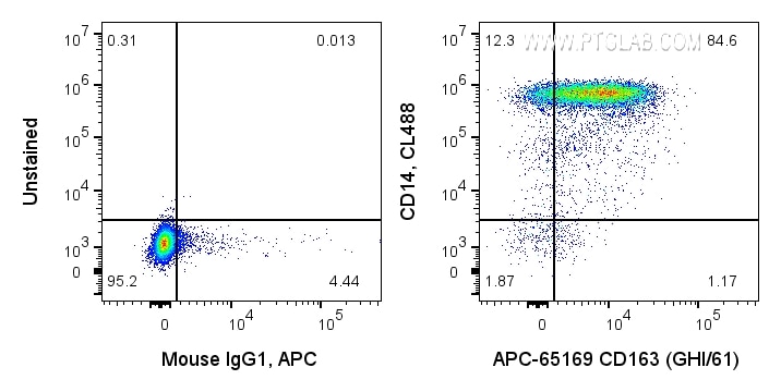 The CD163 antibody from Proteintech is a mouse monoclonal antibody to a glycoprotein preparation from hairy cell leukemia spleen of human CD163. This antibody recognizes human antigen. The CD163 antibody has been validated for the following applications: FC analysis. This antibody is apc.