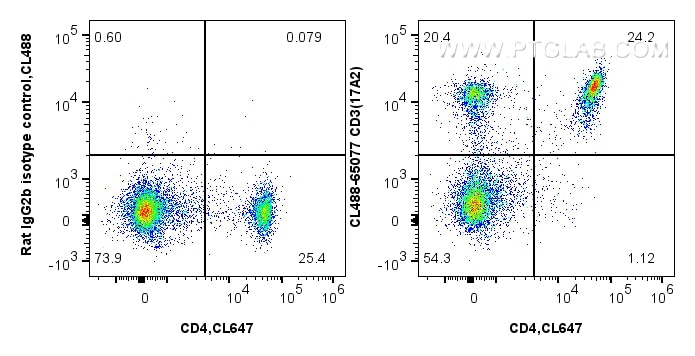 The CD3 antibody from Proteintech is a rat monoclonal antibody to a γδtcr-positive t-t hybridoma d1 of mouse CD3. This antibody recognizes mouse antigen. The CD3 antibody has been validated for the following applications: IF/ICC, FC analysis. This antibody is coraliteR plus 488.