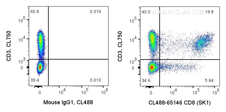 The CD8 antibody from Proteintech is a mouse monoclonal antibody to a n/a of human CD8. This antibody recognizes human antigen. The CD8 antibody has been validated for the following applications: FC analysis. This antibody is coraliteR plus 488.