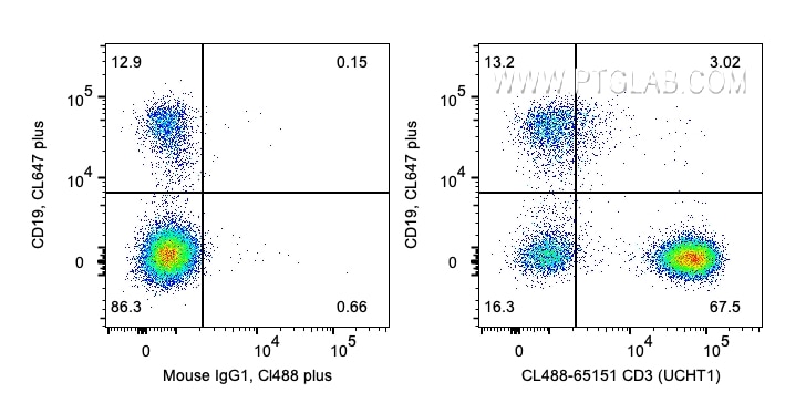 The CD3 antibody from Proteintech is a mouse monoclonal antibody to a n/a of human CD3. This antibody recognizes human antigen. The CD3 antibody has been validated for the following applications: FC analysis. This antibody is coraliteR plus 488.