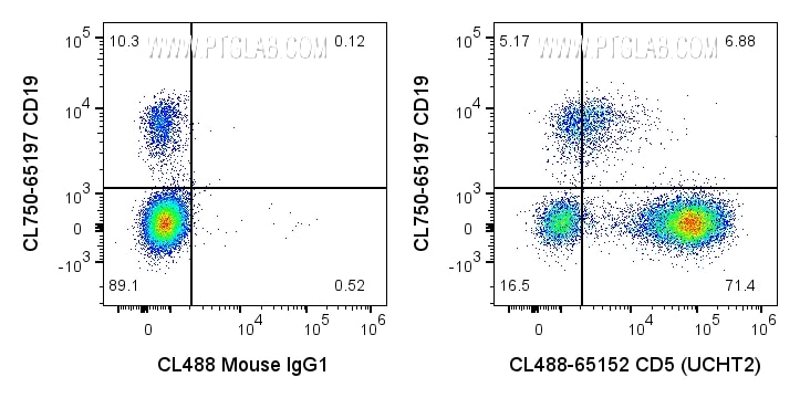 The CD5 antibody from Proteintech is a mouse monoclonal antibody to a n/a of human CD5. This antibody recognizes human antigen. The CD5 antibody has been validated for the following applications: FC analysis. This antibody is coraliteR plus 488.