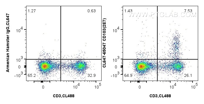 The CD103 antibody from Proteintech is a hamster monoclonal antibody to a c57bl/6j mouse intestinal intraepithelial lymphocytes (iel) of mouse CD103. This antibody recognizes mouse antigen. The CD103 antibody has been validated for the following applications: FC analysis. This antibody is coraliteR plus 647.