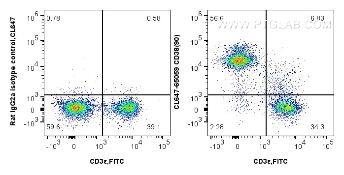 The CD38 antibody from Proteintech is a rat monoclonal antibody to a mouse bone marrow pre-b cells of mouse CD38. This antibody recognizes mouse antigen. The CD38 antibody has been validated for the following applications: IF/ICC, FC analysis. This antibody is coraliteR plus 647.