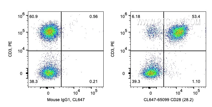 The CD28 antibody from Proteintech is a mouse monoclonal antibody to a n/a of human CD28. This antibody recognizes human antigen. The CD28 antibody has been validated for the following applications: FC analysis. This antibody is coraliteR plus 647.