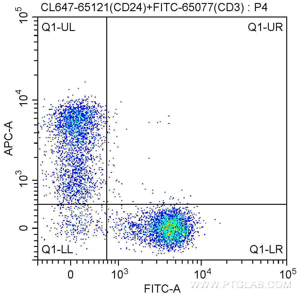 The CD24 antibody from Proteintech is a rat monoclonal antibody to a c57bl/10 mouse splenic t cells and concanavalin a-activated splenocytes of mouse CD24. This antibody recognizes mouse antigen. The CD24 antibody has been validated for the following applications: FC analysis. This antibody is coraliteR plus 647.